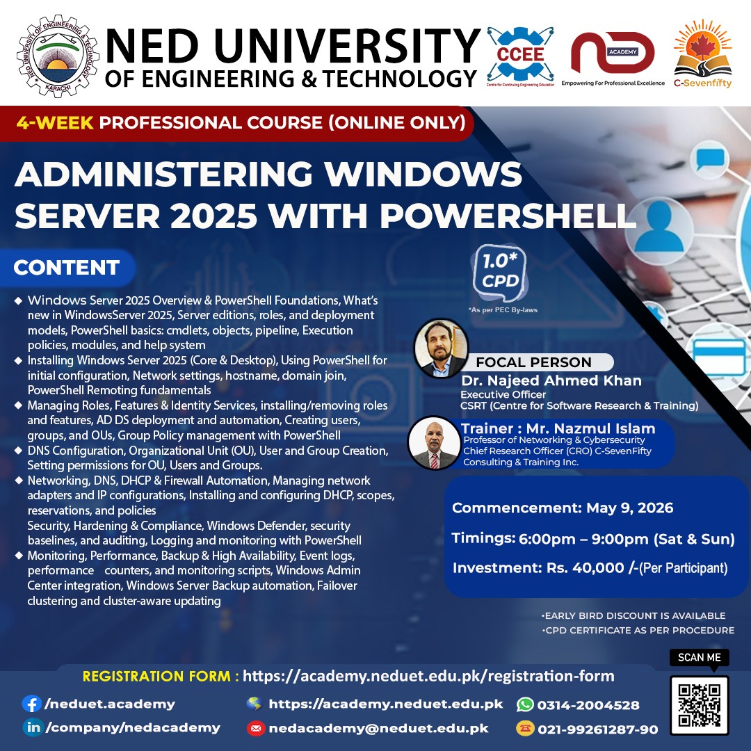 Gallery Administering Windows Server 2025 with PowerShell PROFESSIONAL COURSE Investment : Rs. 40,000/- per participant Information Of Course Category Short Courses Duration Time 4-Week Level Available for all Registration Form Click here to join our WhatsApp group for more information ** Tutorial Video ** (How to generate fee voucher) Generate Fee Voucher (only for registered students) Course Price Display Investment : Rs. 40,000/- per participant On Course Features 1.0 CPD as per PEC By-Laws Certificate of Competence upon Successful Completion. Access to NED University resources