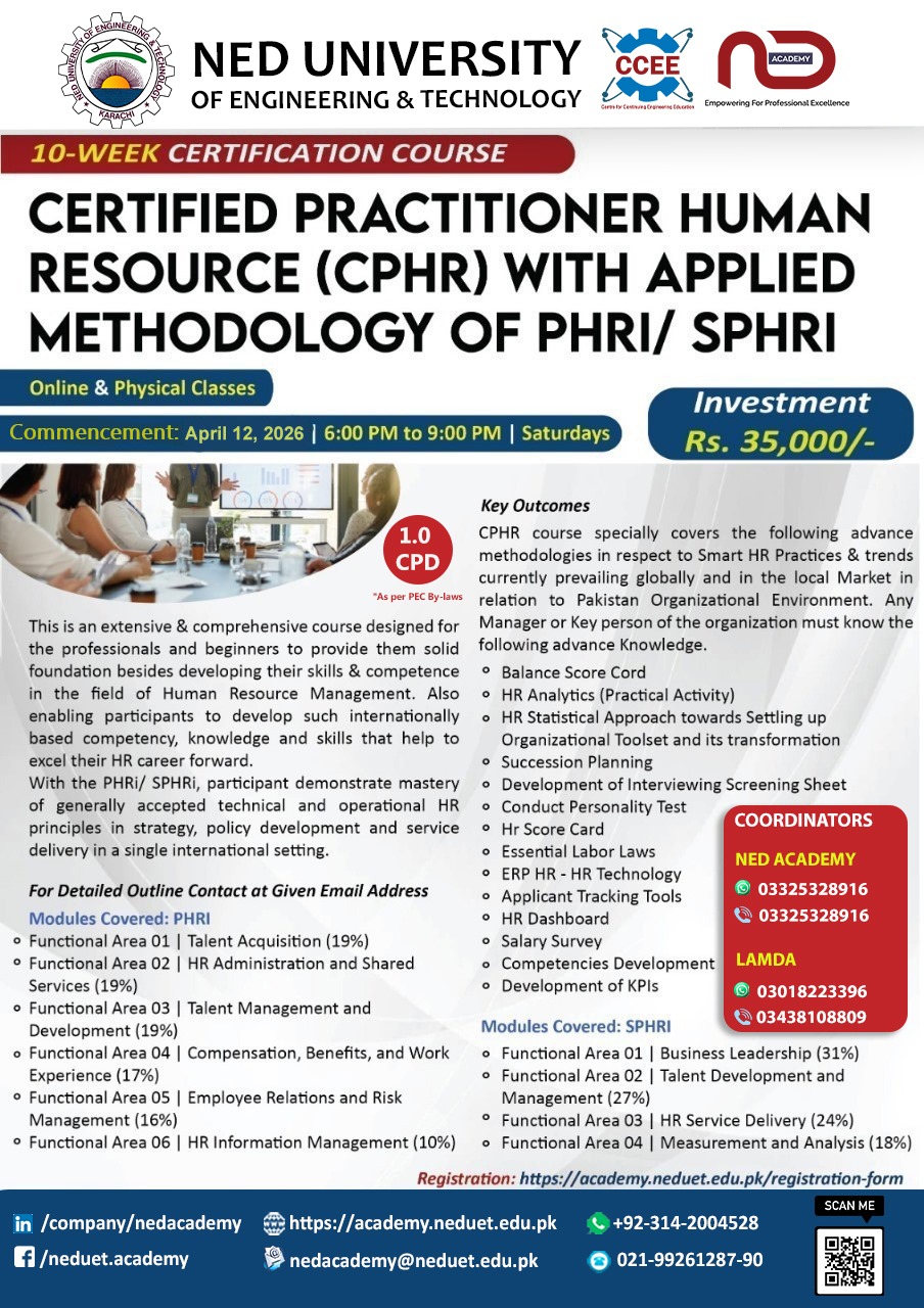 Gallery Certified Practitioner Human Resource (CPHR) With Applied Methodology Of PHRi/ SPHRi PROFESSIONAL CERTIFICATION Investment : Rs. 35,000/- Information Of Course Category Certifications LAMBDA Certifications Duration Time 6 Week Level Available for all Registration Form Click here to join our WhatsApp group for more information ** Tutorial Video ** (How to generate fee voucher) Generate Fee Voucher (only for registered students) Course Price Display Investment : Rs. 35,000/- On Course Features Certificate of Completion from NED Access to NED University resource 1.0 CPD as per PEC By-Laws