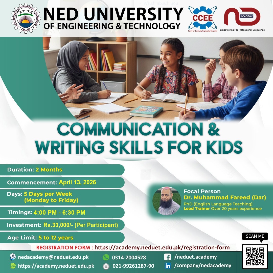 Gallery Communication and Writing Skills for Kids Investment : Rs. 30,000/- per participant Information Of Course Category Short Courses Duration Time 2-Month Level Beginner Registration Form Click here to join our WhatsApp group for more information ** Tutorial Video ** (How to generate fee voucher) Generate Fee Voucher (only for registered students) Course Price Display Investment : Rs. 30,000/- per participant On Course Features Age Limit: 5 to 12 years Certificate of Completion from NED Access to NED University resources