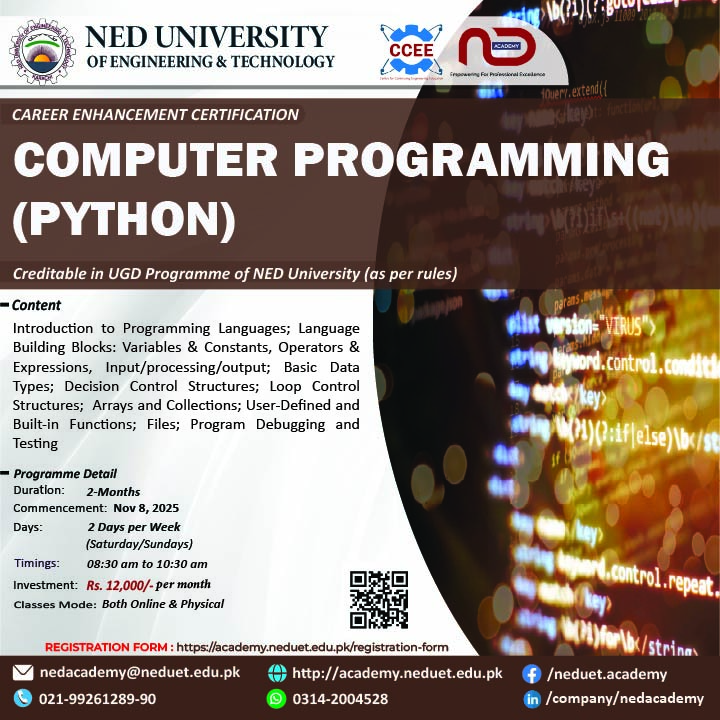 Gallery Computer Programming (Python) CAREER ENHANCEMENT CERTIFICATION Information Of Course Category Certifications IT Certifications Duration Time 2-Month Level Available for all Registration Form ** Tutorial Video ** (How to generate fee voucher) Generate Fee Voucher (only for registered students) Payment Proof Form On Course Features Certificate of Completion from NED Access to NED University resource