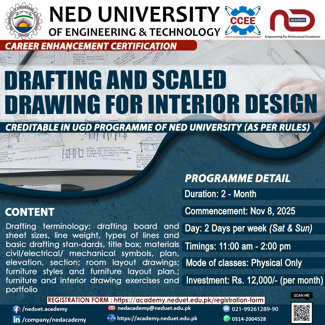 Gallery Drafting And Scaled Drawing For Interior Design CAREER ENHANCEMENT CERTIFICATION CREDITABLE IN UGD PROGRAMME OF NED UNIVERSITY (AS PER RULES) Investment : Rs. 12,000/- Per Month Information Of Course Category Certifications Duration Time 2-Month Level Available for all Registration Form ** Tutorial Video ** (How to generate fee voucher) Generate Fee Voucher (only for registered students) Payment Proof Form Course Price Display Investment : Rs. 12,000/- Per Month On Course Features Certificate of Completion from NED Access to NED University resournce