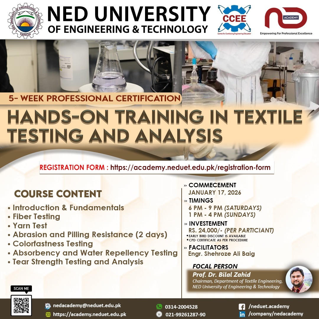 Gallery Hands-on Training in Textile Testing & Analysis PROFESSIONAL CERTIFICATION Investment : Rs. 24,000/- per participant Information Of Course Category Certifications Duration Time 5-week Level Available for all Registration Form Click here to join our WhatsApp group for more information ** Tutorial Video ** (How to generate fee voucher) Generate Fee Voucher (only for registered students) Payment Proof Form Course Price Display Investment : Rs. 24,000/- per participant On Course Features Certificate of Completion from NED Access to NED University resource