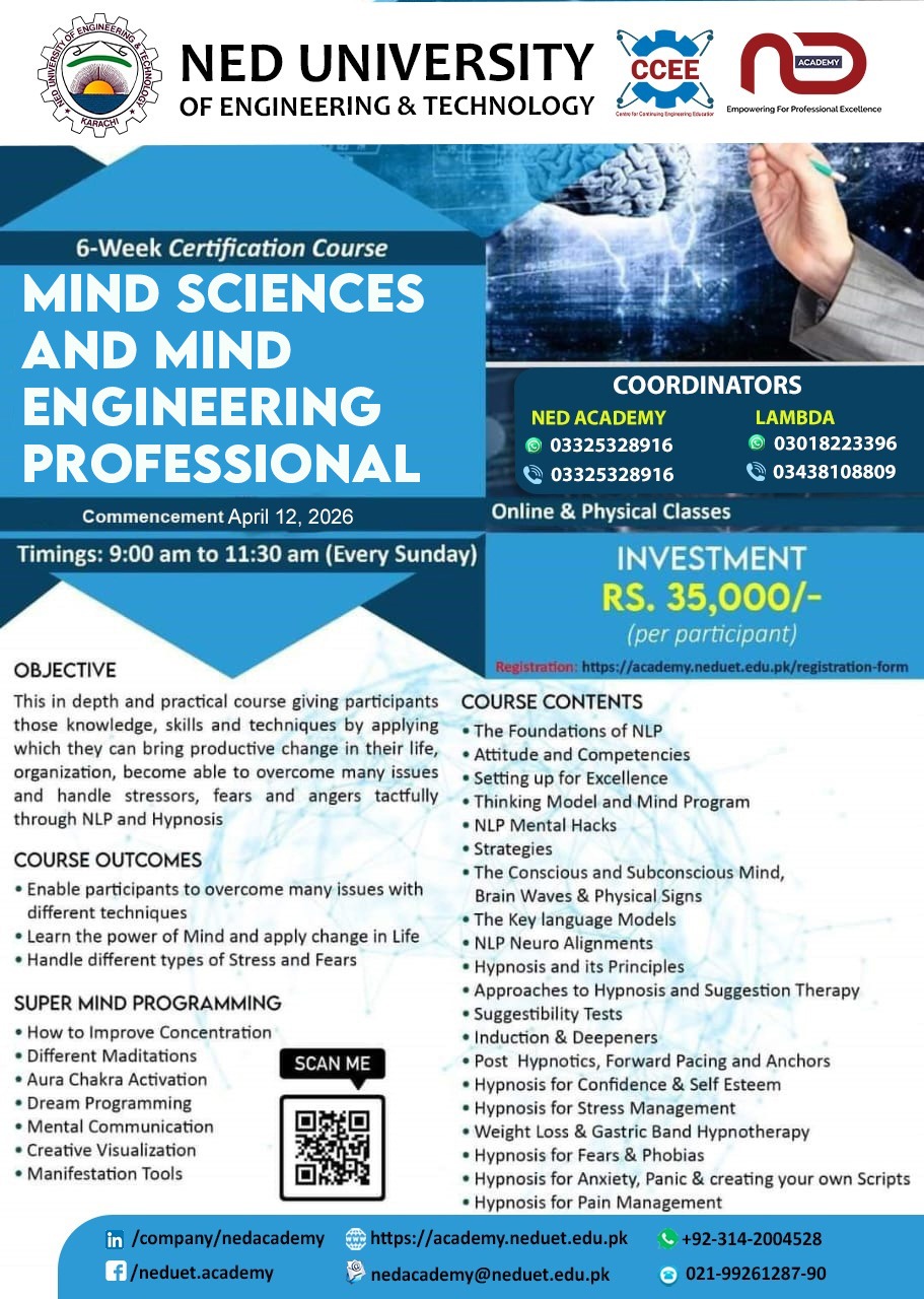 Gallery Mind Sciences and Mind Engineering Professional PROFESSIONAL CERTIFICATION What Will You Learn? This in depth and practical course will provide participants with those skills, knowledge and techniques by applying which they can bring productive change in their personal and professional life. Investment : Rs. 35,000/- per participant Information Of Course Category Certifications LAMBDA Certifications Duration Time 6-Week Level Available for all Registration Form Click here to join our WhatsApp group for more information ** Tutorial Video ** (How to generate fee voucher) Generate Fee Voucher (only for registered students) Course Price Display Investment : Rs. 35,000/- per participant On Course Features Certificate of Completion from NED Access to NED University resource