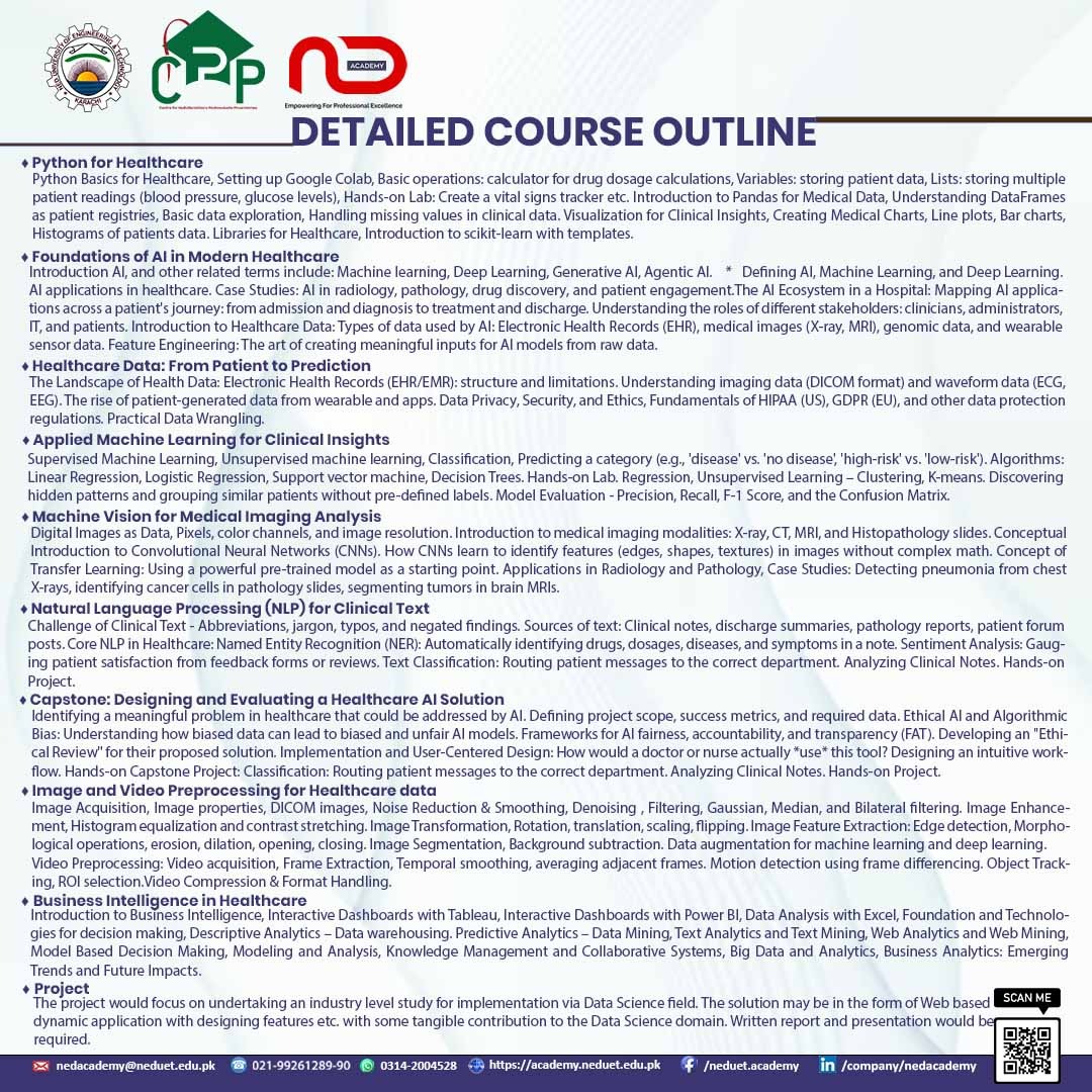 Gallery PGD in AI in Modern HealthCare 1- YEAR POSTGRADUATE DIPLOMA PROGRAMME Information Of Course Category Postgraduate Diplomas Duration Time 1-Year Level Graduate Procedure of Admission 1- Fill out the Registration Form 2- Pay the Registration Fee 3- Interview 4- Course Fee Submission Click here to join our WhatsApp group for more information PGD Advertisement PGD FAQs Fee Structure PGD Project Guidelines PGD Final Project Presentation Annexure PGD 5 Final Project Report Annexure Expression of Interest Form ** Tutorial Video ** (How to fill the registration form & generate fee voucher) Registration Form Generate Fee Voucher (only for registered students) PGD Document Uploading Form Other Application Forms 1st Provitional List-PGD (Spring-I-2024) PGD Results Time Table Exam Schedule Yearly Calendar Off Course Features 4.0 CPD as per PEC By-Laws Certificate of Completion from NED Access to NED University resources