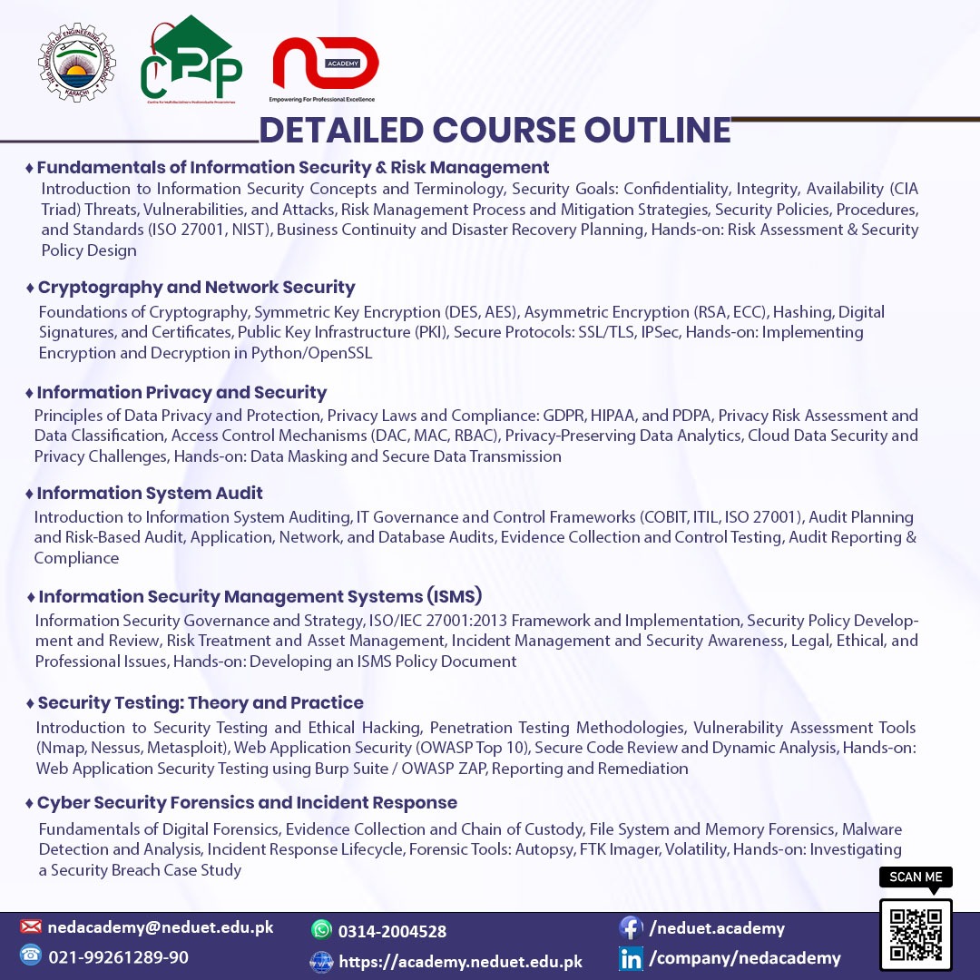 Gallery PGD In Information Security (IS) 1-Year Postgraduate Diploma Information Of Course Category Postgraduate Diplomas Duration Time 1-Year Level Graduate Procedure of Admission 1- Fill out the Registration Form 2- Pay the Registration Fee 3- Interview 4- Course Fee Submission Click here to join our WhatsApp group for more information PGD Advertisement PGD FAQs Fee Structure PGD Project Guidelines PGD Final Project Presentation Annexure PGD 5 Final Project Report Annexure Expression of Interest Form ** Tutorial Video ** (How to fill the registration form & generate fee voucher) Registration Form Generate Fee Voucher (only for registered students) PGD Document Uploading Form Other Application Forms 1st Provitional List-PGD (Spring-I-2024) PGD Results Time Table Exam Schedule Yearly Calendar Off Course Features Diploma of participation upon successful completion of the course 4.0 CPD as per PEC By-Laws Access to NED University resource