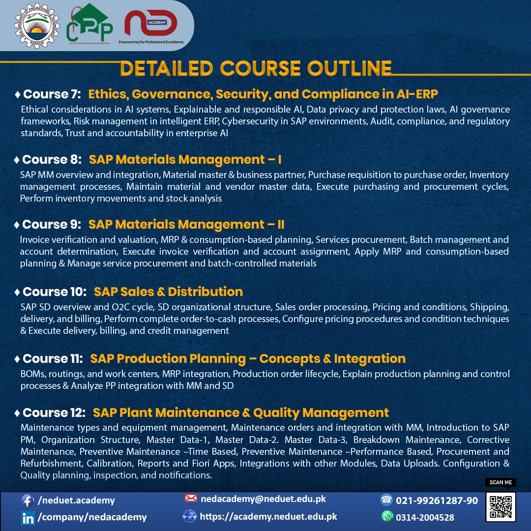 Gallery PGD in AI in Enterprise Resource Planning (ERP) - SAP POSTGRADUATE DIPLOMA PROGRAMME Information Of Course Category Postgraduate Diplomas Duration Time 1-Year Level Graduate Procedure of Admission 1- Fill out the Registration Form 2- Pay the Registration Fee 3- Interview 4- Course Fee Submission Click here to join our WhatsApp group for more information PGD Advertisement PGD FAQs Fee Structure PGD Project Guidelines PGD Final Project Presentation Annexure PGD 5 Final Project Report Annexure Expression of Interest Form ** Tutorial Video ** (How to fill the registration form & generate fee voucher) Registration Form Generate Fee Voucher (only for registered students) PGD Document Uploading Form Other Application Forms 1st Provitional List-PGD (Spring-I-2024) PGD Results Time Table Exam Schedule Yearly Calendar Off Course Features 4.0 CPD as per PEC By-Laws Diploma of participation upon successful completion of the course Access to NED University resources