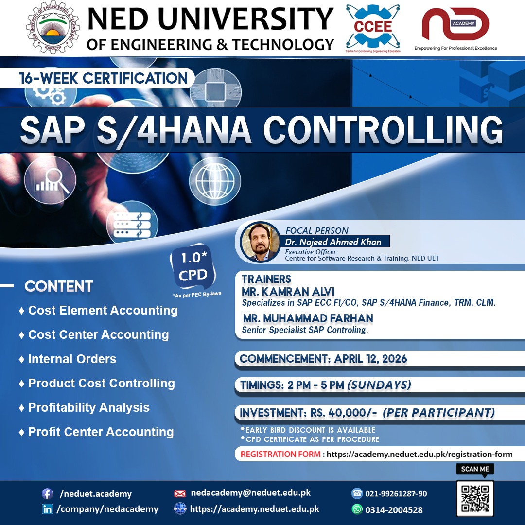 Gallery SAP S/4HANA Controlling CERTIFICATION What Will You Learn? Cost Element Accounting Cost Center Accounting Internal Orders Product Cost Controlling Profitability Analysis Profit Center Accounting Investment : Rs. 40,000/- per participant Information Of Course Category Certifications Duration Time 16-Week Level Available for all Registration Form Click here to join our WhatsApp group for more information ** Tutorial Video ** (How to generate fee voucher) Generate Fee Voucher (only for registered students) Course Price Display Investment : Rs. 40,000/- per participant On Course Features 1.0 CPD as per PEC By-Laws Certificate of Competence upon Successful Completion. Access to NED University resources