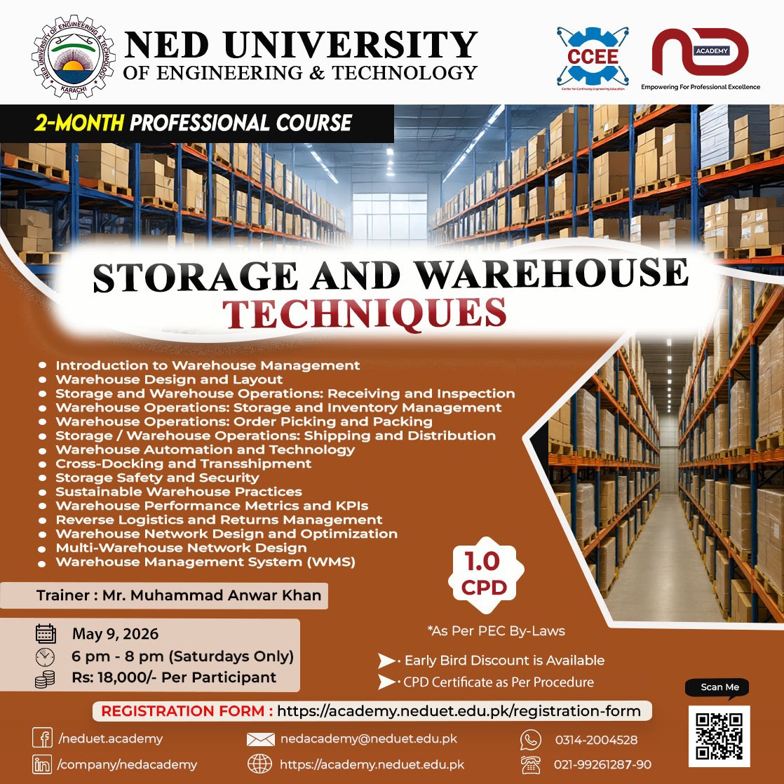 Gallery Storage and Warehouse Techniques PROFESSIONAL COURSE Investment : Rs. 18,000/- per participant Information Of Course Category Short Courses Certifications Duration Time 2-Month Level Available for all Registration Form Click here to join our WhatsApp group for more information ** Tutorial Video ** (How to generate fee voucher) Generate Fee Voucher (only for registered students) Payment Proof Form Course Price Display Investment : Rs. 18,000/- per participant On Course Features Certificate of Completion from NED Access to NED University resource 1.0 CPD as per PEC By-Laws